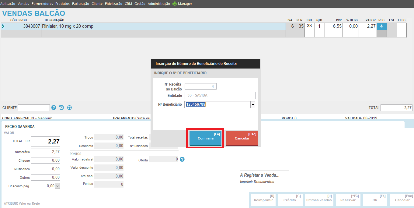 Clique em confirmar [F4] para recolher e validar o nº de beneficiário.