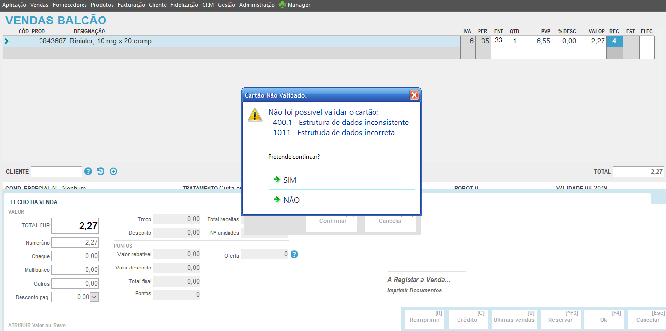 Se o cartão não for validado, surge a mensagem de erro associada e a informação “cartão não validado”.