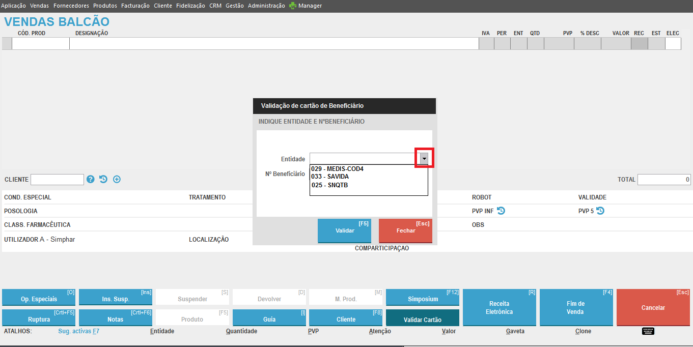 Insira o Nº de Beneficiário ou selecione o Nº de Beneficiário apresentado pelo Winphar, caso o mesmo se encontre gravado previamente na Ficha de Cliente.