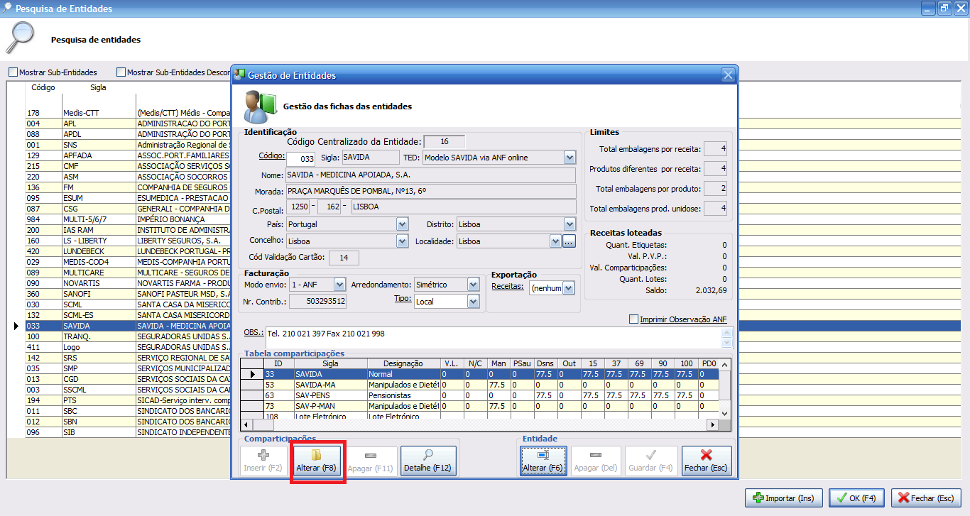 Selecione a opção Alterar [F8] na tabela de comparticipação desejada.