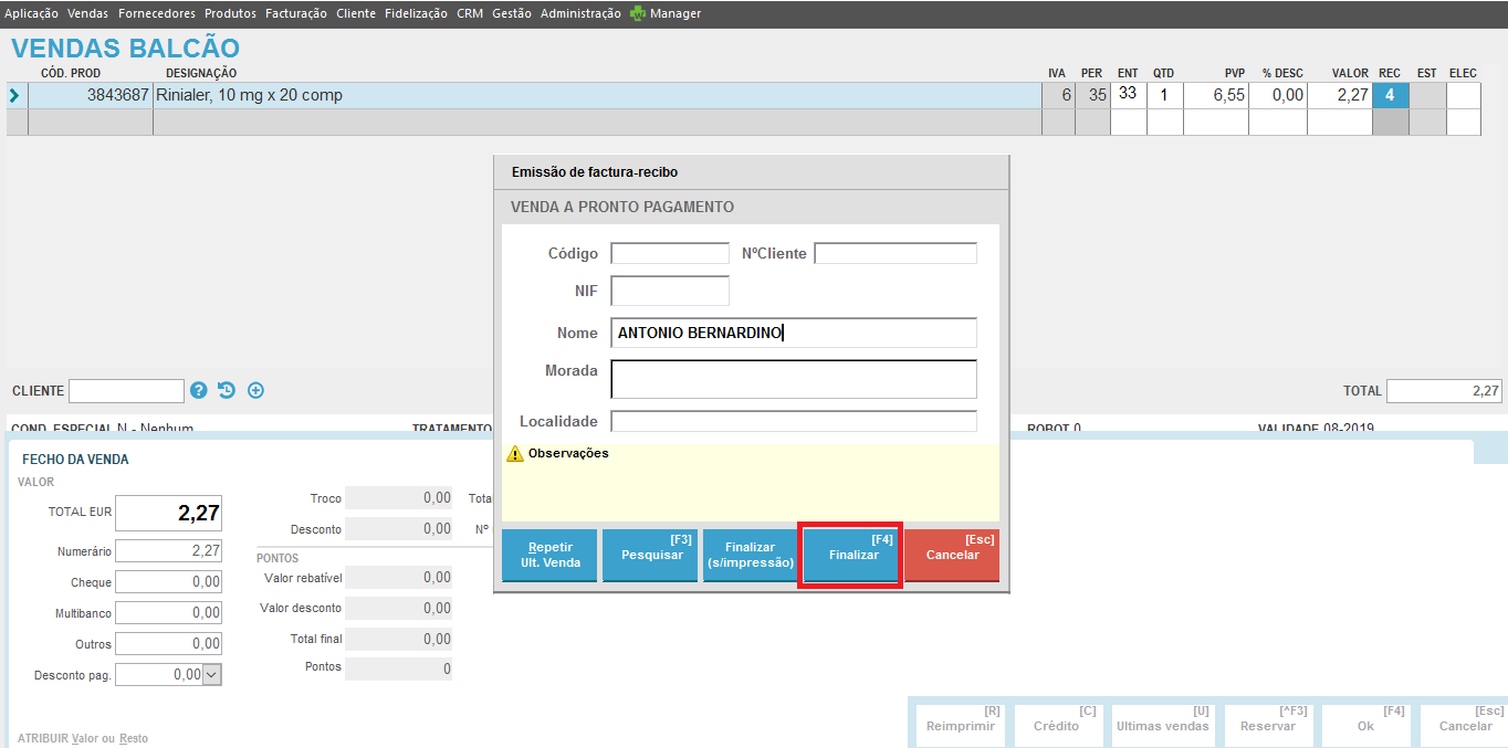 Caso contrário prossiga com a inserção de produtos ao balcão.