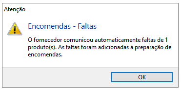 Após a transmissão de uma encomenda, caso o fornecedor reporte falhas, será apresentada uma mensagem dando conta do número de produtos em falta. Estas faltas serão automaticamente acrescentadas à preparação de encomenda ou lista de faltas (conforme a configuração do seu Winphar).