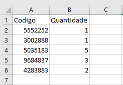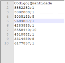 Este tem que ser composto por duas colunas com os cabeçalhos: Codigo e Quantidade – note que “Codigo” está sem acento. O separador de colunas deve ser o ponto e virgula “;”. O aspecto final do ficheiro csv será este: