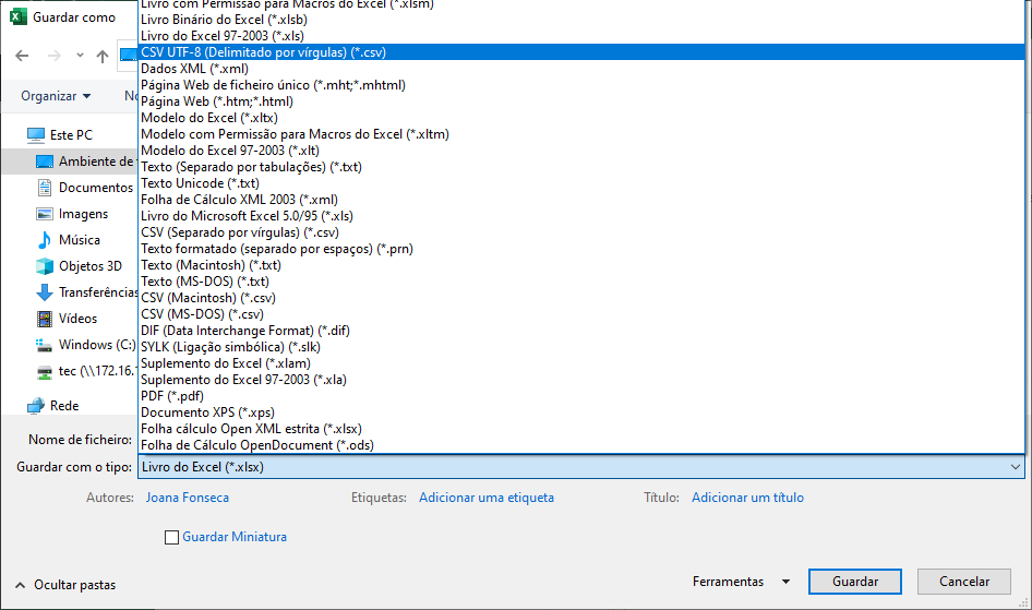 Para criar um ficheiro csv, crie um ficheiro em excel com as características acima descritas.