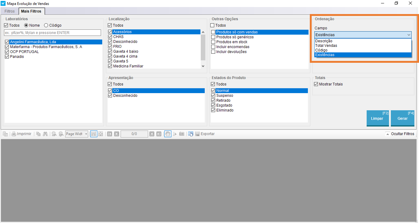 No Mapa Evolução de Vendas seleccione a opção Mais filtros. Na janela de Ordenação tem um novo campo – Existências.