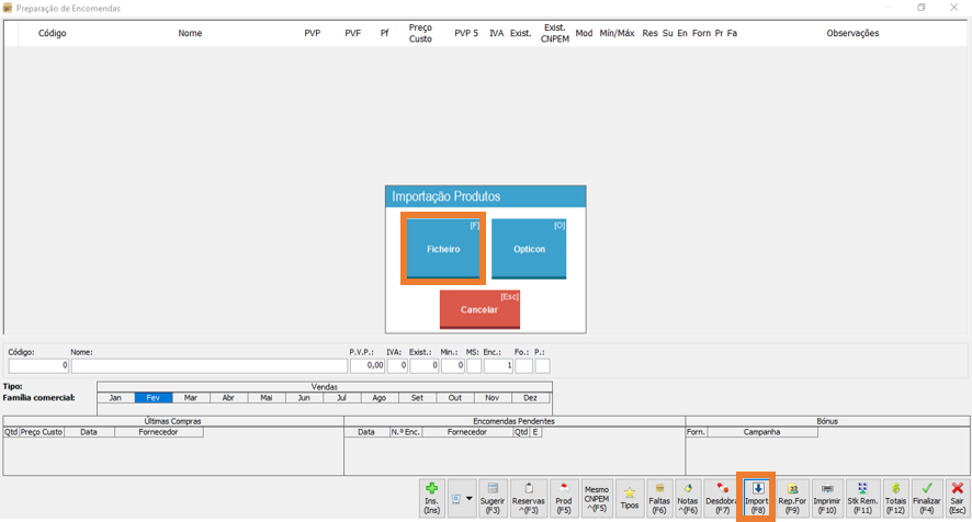 - Na janela Importação Produtos selecione a opção Ficheiro.