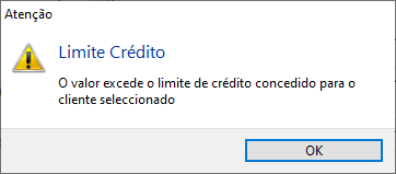 Clique em Sim caso deseje transferir o crédito para o cliente que selecionou por último. Neste caso o Winphar verifica se este cliente tem autorização de crédito e se ainda não ultrapassou o limite autorizado. Caso tenha excedido o limite de crédito, surge-lhe em ecrã a janela seguinte: