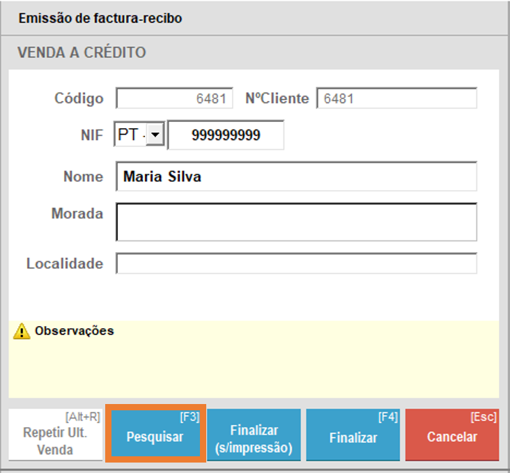 Como sabe, no Winphar, ao efetuar uma venda a crédito, o utilizador pode alterar os dados fiscais da Fatura. Para alterar os dados da Fatura, na janela Emissão de factura-recibo clique em Pesquisar Cliente.