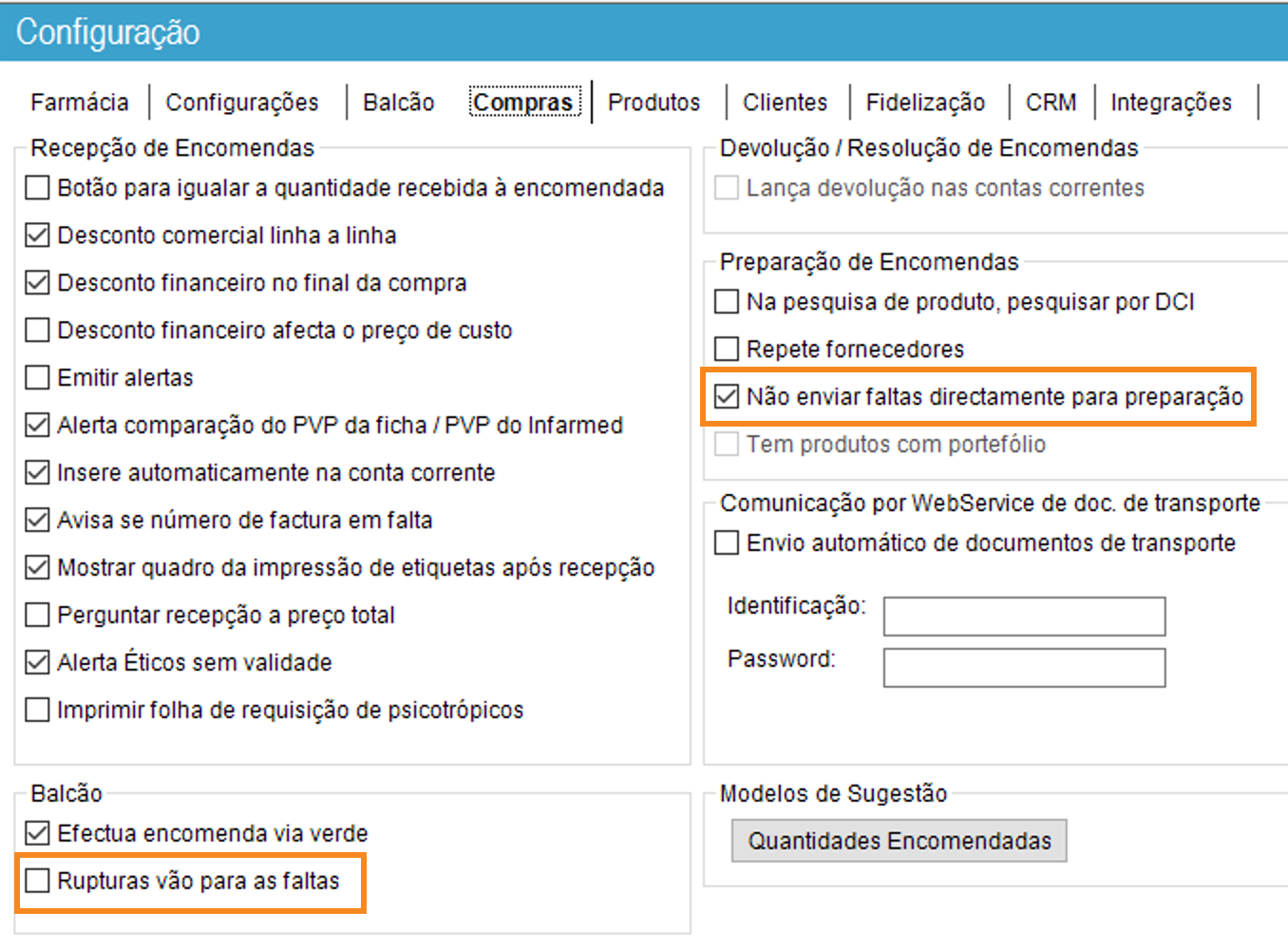 Existe agora uma definição para o tratamento das faltas com origem na Recepção Encomendas e outra para o tratamento das faltas vindas do Balcão. Para alterar a configuração, aceda a Administração > Configuração > Compras.