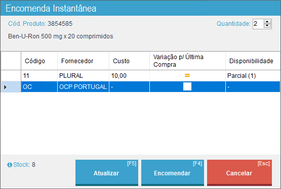 Caso altere o número de embalagens a encomendar no campo Quantidade, clique em Atualizar [F5] para efectuar nova consulta aos fornecedores. A encomenda, através do botão Encomendar [F4], é efectuada para o fornecedor cuja linha está seleccionada.