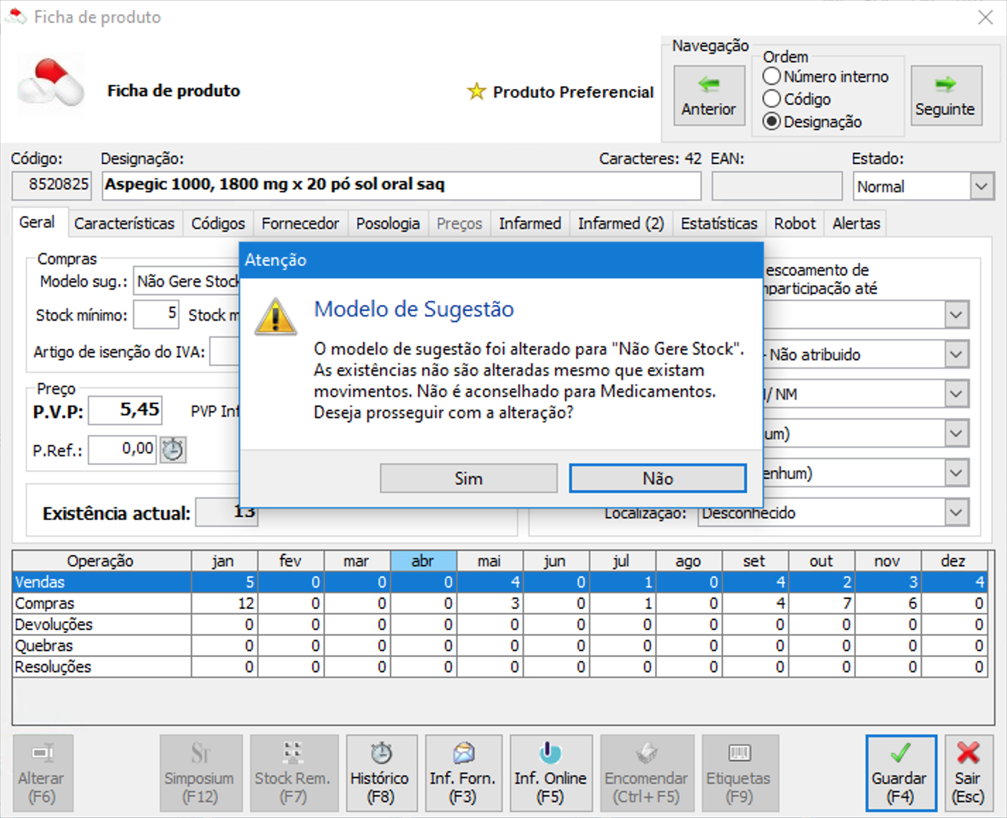 Quando o modelo de “Não Gere Stock” for escolhido para um medicamento, o Winphar vai exibir um aviso de forma a garantir que este não é escolhido por engano.