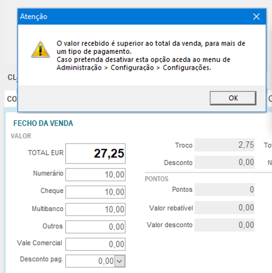 A utilização de várias formas de pagamento (e.g. multibanco e dinheiro) na mesma venda pode provocar erros e dificultar a verificação de caixa no fim do dia.