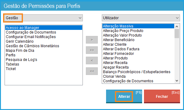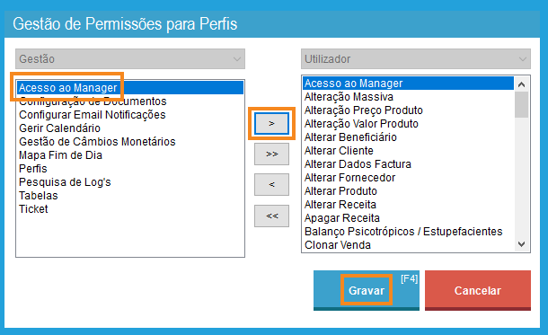 A permissão Acesso ao Manager deve ser adicionada ao perfil. Após Gravar, todos os utilizadores com o perfil escolhido passam a ter acesso ao Winphar Manager.