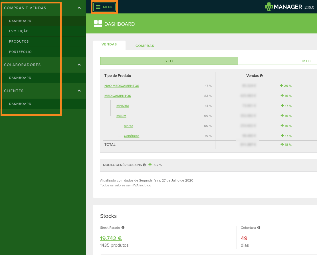 O Winphar Manager proporciona acesso a um conjunto de dados de gestão, organizados por vários temas. O MENU no canto superior esquerdo dá acesso à navegação pelas várias áreas.