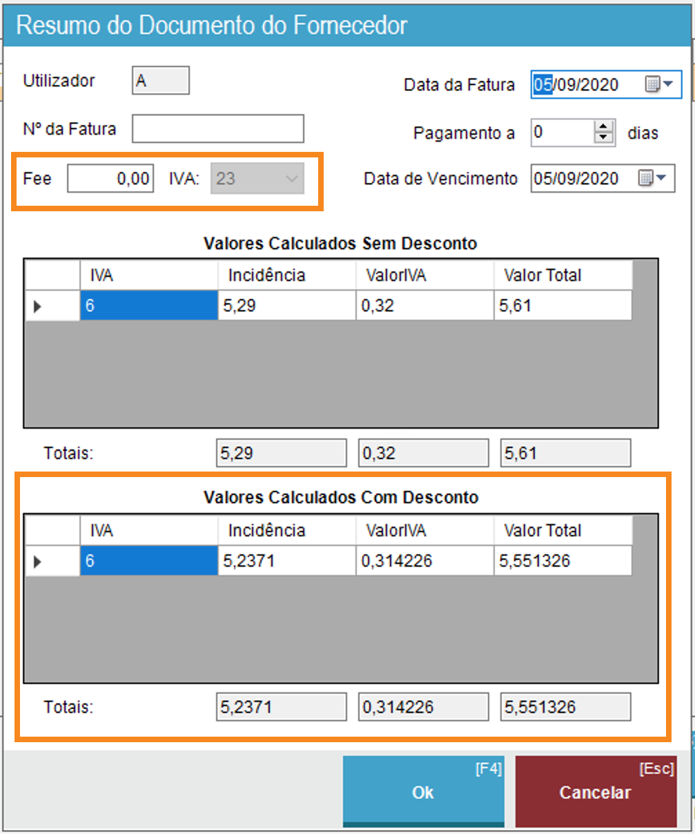 O valor da fatura após desconto e o valor total passaram a ser apresentados com mais do que duas casas decimais. Torna-se assim mais fácil introduzir o valor correto da fatura quando o fornecedor apenas realiza arredondamentos no final da fatura em vez de por linha ou quando trabalha com mais do que duas casas decimais. O valor que passa para a conta corrente é arredondado ao cêntimo.