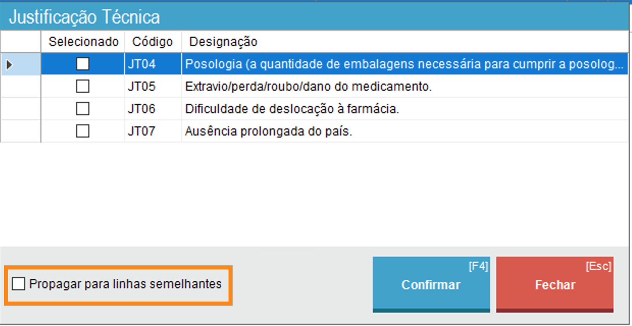 Ao seleccionar uma Justificação Técnica (JT) para uma linha, pode escolher propagar a mesma JT para todas as linhas da mesma receita que apresentam o mesmo erro. Esta operação apenas deve ser usada quando a JT a utilizar é efectivamente a mesma para todas as linhas que apresentam o mesmo erro.