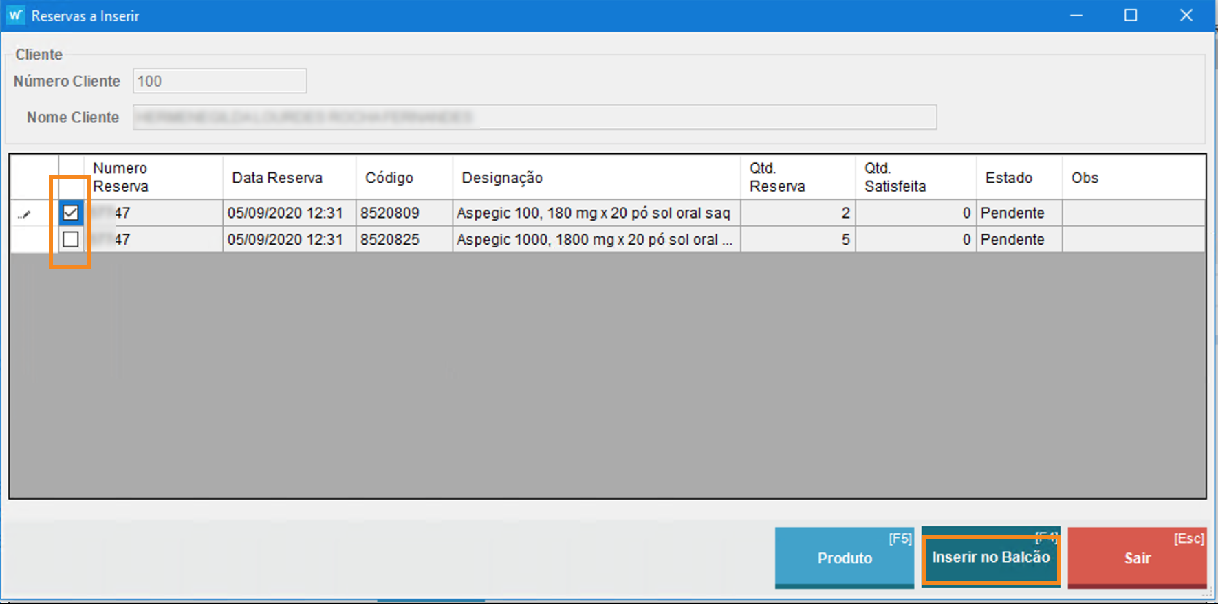 Ao selecionar Reservas por tratar, é apresentada a lista dos produtos incluídos nas reservas ainda por pagar, quer estejam no estado Pendente ou Satisfeita. Pode selecionar os produtos para inserção direta no balcão. A linhas escolhidas passam automaticamente para o balcão, onde poderá concluir a venda e entregar os produtos ao utente. As linhas de reserva inseridas ao balcão passam automaticamente para o estado Resolvida.