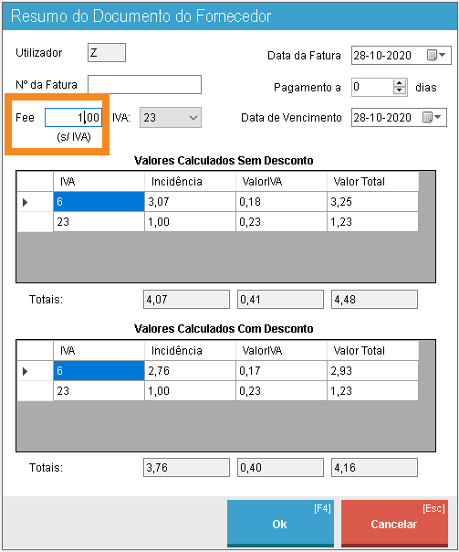 O registo, na receção de encomenda, do fee cobrado por um fornecedor sobre a totalidade da fatura sofreu melhorias. Esta funcionalidade, lançada na versão 7.02, passou a esperar a introdução do valor de fee sem IVA.