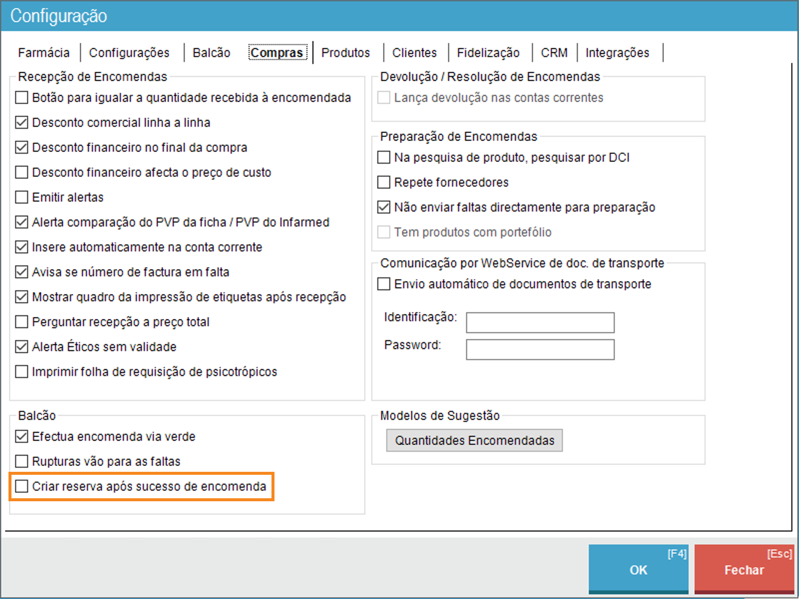A opção de criação de reserva após a encomenda instantânea com sucesso só será apresentada se a opção tiver sido ativada na configuração do Winphar. Para tal, deverá aceder a Administração > Configuração > Compras.