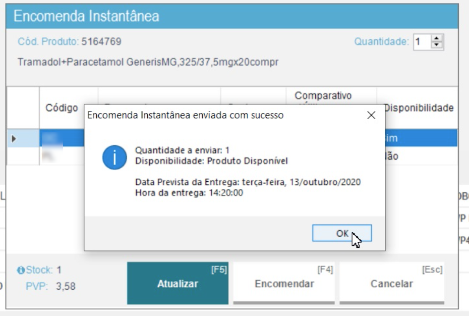 A encomenda instantânea é utilizada para poder garantir, ao utente que tem ao balcão, que o produto pretendido, e atualmente em falta na sua farmácia, ficará disponível em breve. A encomenda instantânea é assim normalmente usada para encomendar um produto que ficará reservado para o utente.