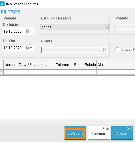 A Listagem de Produtos Reservados, disponível na gestão de Reservas (Vendas > Reservas), proporciona informação sobre as reservas pendentes para cada produto. Esta funcionalidade está disponível através do botão Listagem.