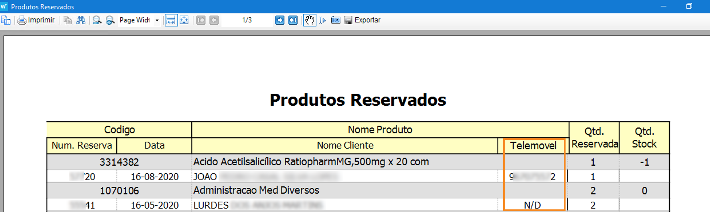 Este mapa passou a incluir o número de telefone do utente, sempre que o mesmo foi registado na reserva.