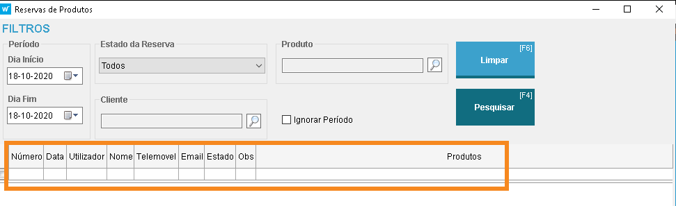 Os campos de resultado podem ser filtrados, ordenados e reorganizados de acordo com a sua preferência. Foi acrescentado um novo campo, Produtos, para que seja possível visualizar imediatamente os produtos incluídos na reserva sem ser necessário Abrir os detalhes da mesma.