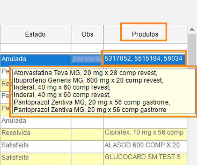 Caso a reserva consista num só produto, será exibido o nome do mesmo. Caso contenha vários produtos serão exibidos os seus CNPs e o nome dos mesmos pode ser visualizado passando o cursor do rato sobre o campo.