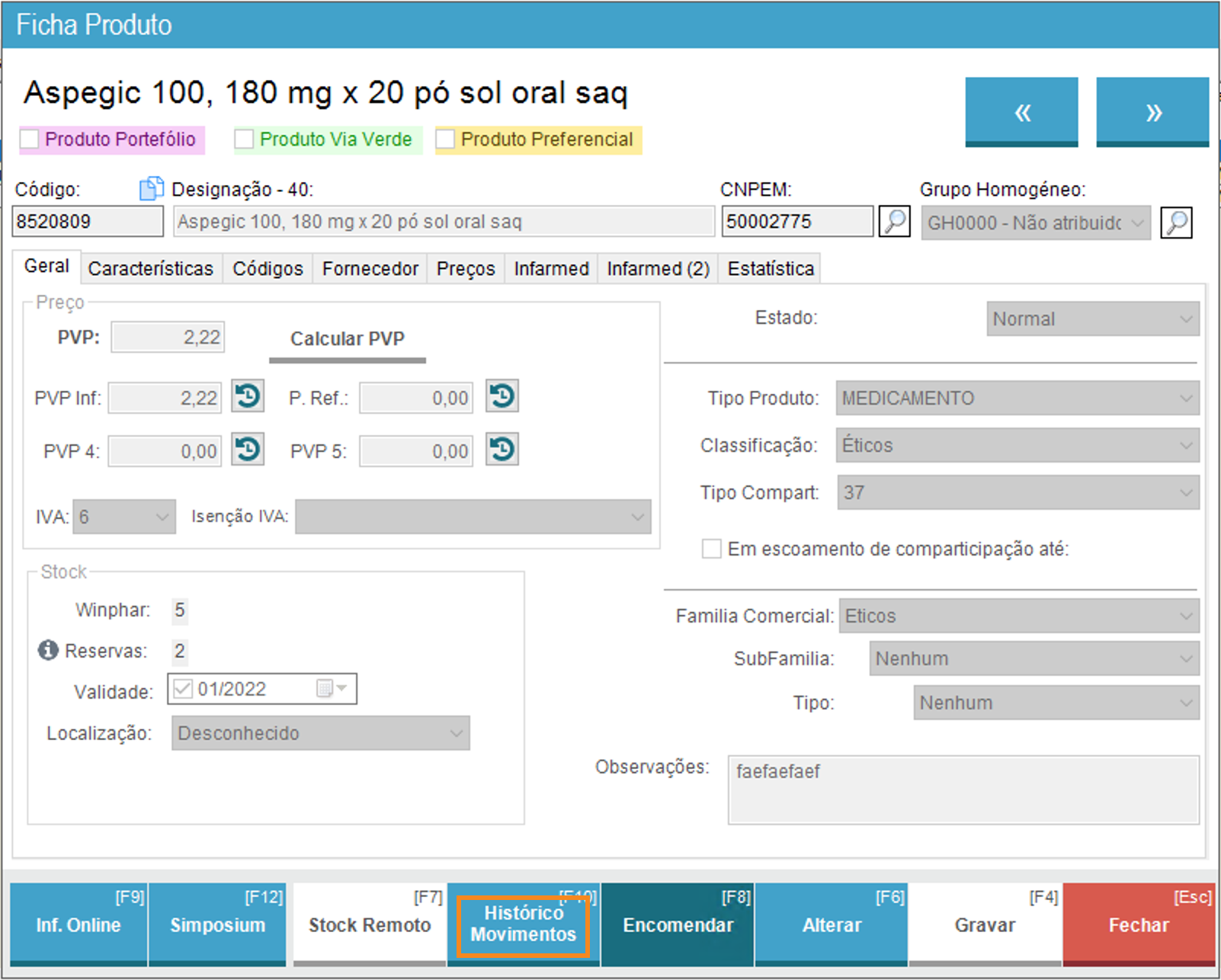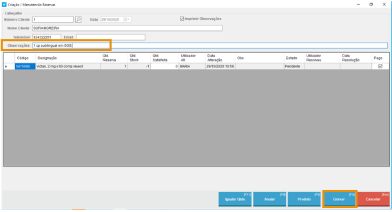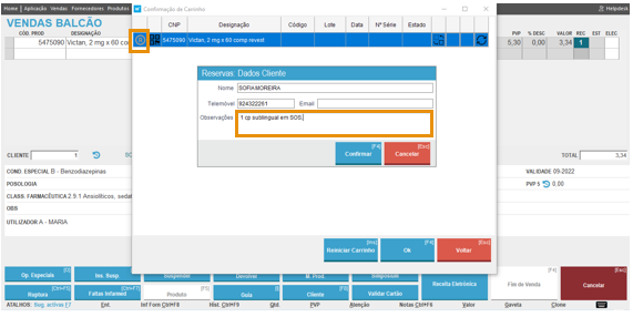 No ato de reserva durante a venda é agora possível escrever uma observação, como por exemplo a posologia prescrita pelo médico.