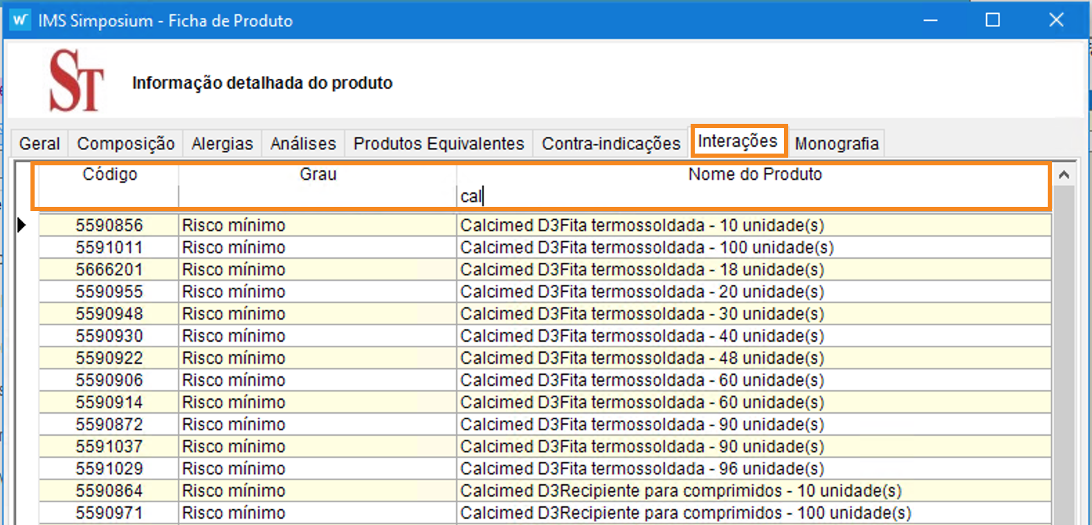 A pesquisa de interações também está mais útil e fácil de usar. Pode ser acedida através do botão Simposium da Ficha de Produto, separador Interações. São exibidos os produtos com interações conhecidas com o produto atual, sendo também possível pesquisar/filtrar por CNP, Grau de Risco e Nome do Produto.
