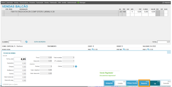 Se decidir avançar com a reserva, é criada uma reserva por satisfazer, não paga e o produto é removido do balcão. Caso pretenda antes criar uma reserva paga, deverá recusar a criação de reserva neste passo e marcar o produto como reservado no final da venda.
