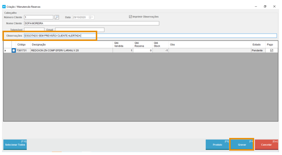 E registar uma Observação numa reserva efetuada apenas no fim da venda.