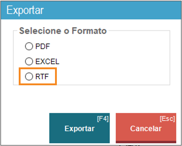 A exportação de relatórios passa a apresentar três formatos: PDF, Excel e RTF. O formato RTF (Rich Text Format) é um formato universal de documentos de texto, aceite pela maior parte dos processadores de texto (e.g. Microsoft Word, Microsoft WordPad, LibreOffice Writer).