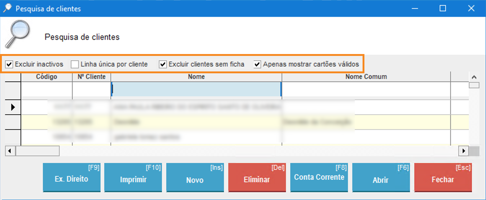 O formulário de Pesquisa de clientes apresenta 4 filtros que afetam a apresentação dos resultados de uma pesquisa: excluir inativos, agregar clientes com vários meios de identificação numa só linha, excluir cliente sem ficha, apenas apresentar documentos de identificação dentro do prazo de validade.