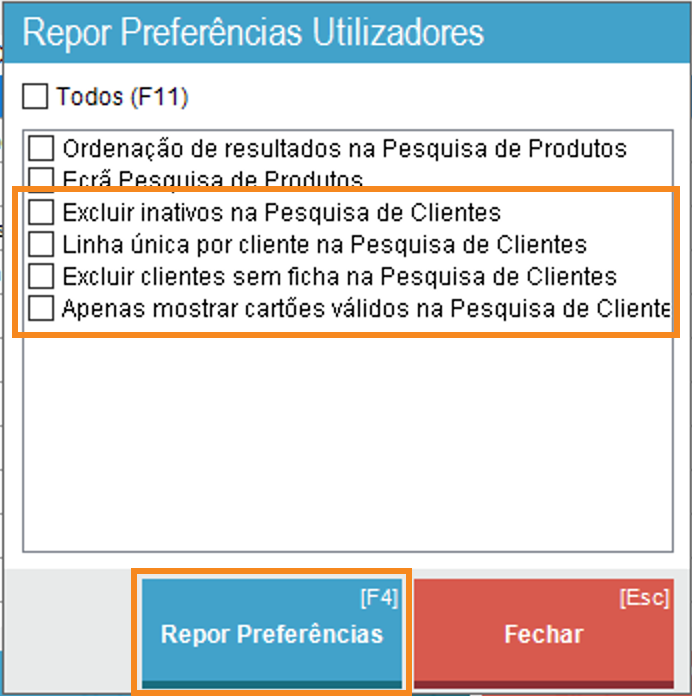 Os filtros selecionados passaram a estar associados ao perfil de cada utilizador. Assim, a escolha efetuada é apresentada no próximo acesso à Pesquisa de clientes, quer esta seja realizada no mesmo ou em outro posto.