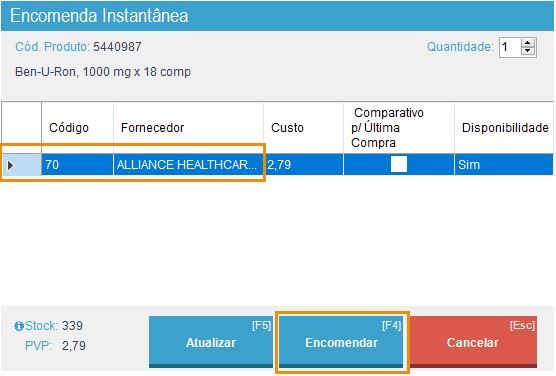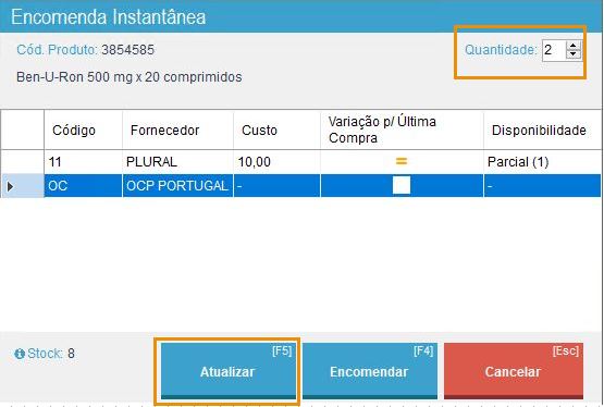 Caso opte por alterar no campo Quantidade o número de embalagens a encomendar, clique depois em Atualizar [F5] para efetuar uma nova consulta em tempo real aos vários fornecedores da farmácia antes de encomendar.