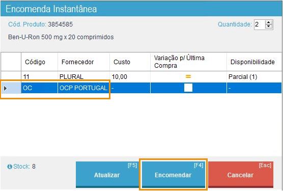 A encomenda, através do botão Encomendar [F4], é efetuada para o fornecedor cuja linha se encontra selecionada.