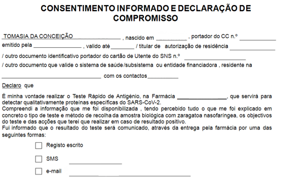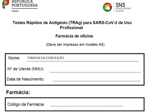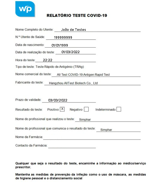 A novidade desta versão é que após o registo do Formulário, vai surgir uma nova janela com o Relatório Final de Teste COVID-19 preenchido.