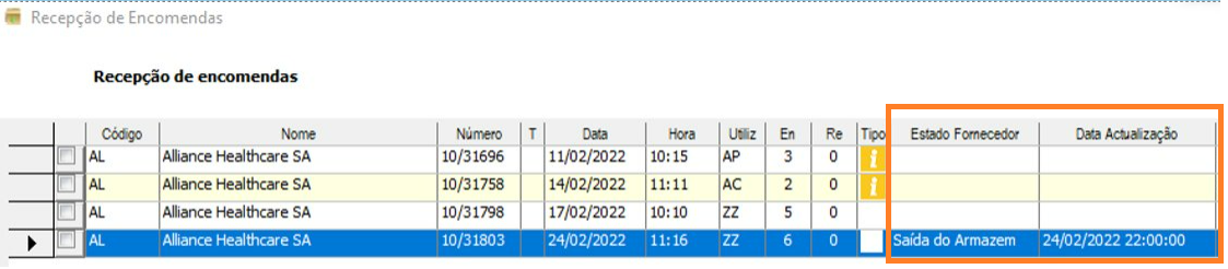 A informação acerca do Estado da Encomenda, bem como a data de atualização é enviada em tempo real pelo fornecedor e irá surgir em duas novas colunas à direita do tipo de Encomenda.