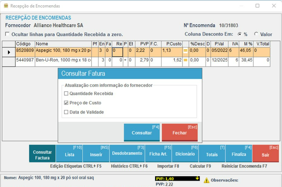 Relembramos que pode aceder à funcionalidade Receção Inteligente através do Menu Receção de Encomendas> Receção Direta> Consultar Fatura. Depois, pode escolher os dados que deseja importar automaticamente do Fornecedor: