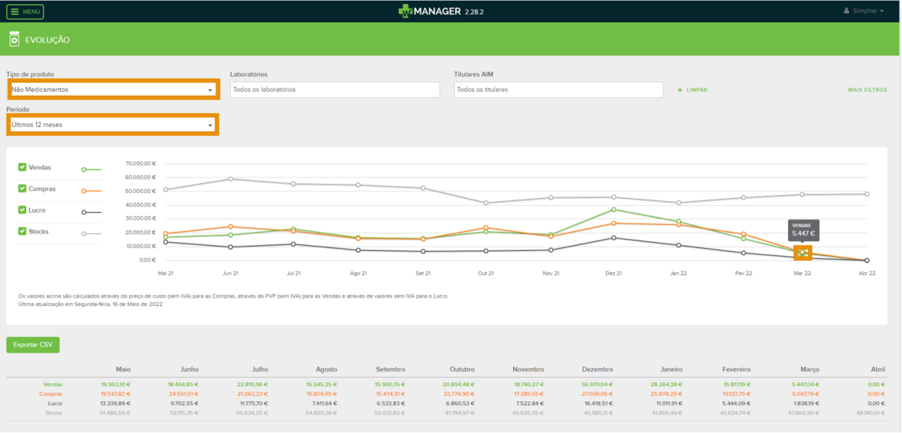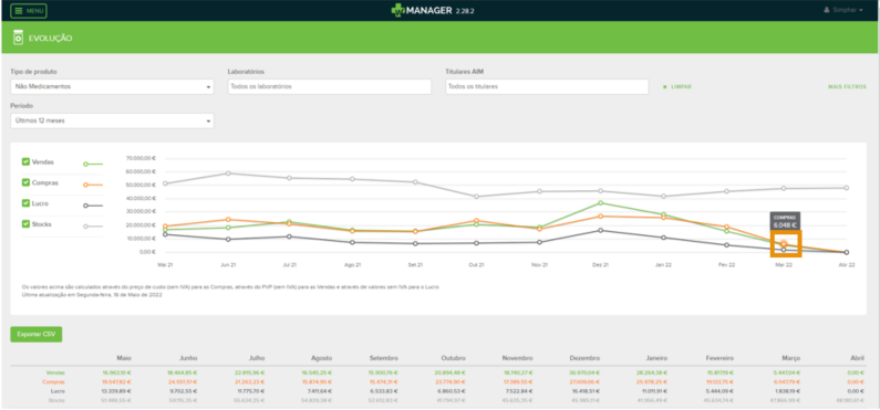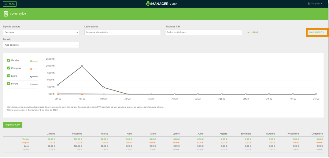 Além dos demais filtros supramencionados, e a pedido de muitas Farmácias Winphar, adicionámos ainda os filtros “sem vendas após”, “com vendas após”, “com existências” e “sem existências”, aos separadores Produtos e Evolução, da dashboard Compras e Vendas.