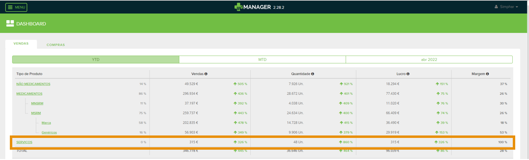 1. Winphar Manager: Nova componente “Serviços” na dashboard Compras e Vendas