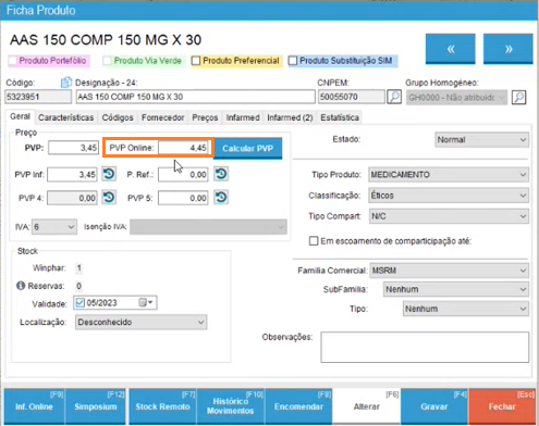 Adicionámos ainda o campo PVP Online à Ficha de Produto que será o preço importado para o Prestashop. No caso de estar preenchido a 0 será enviado por omissão o valor indicado no campo PVP. Isto permite que o mesmo produto tenha preços distintos em locais distintos (Prestashop ou Winphar).