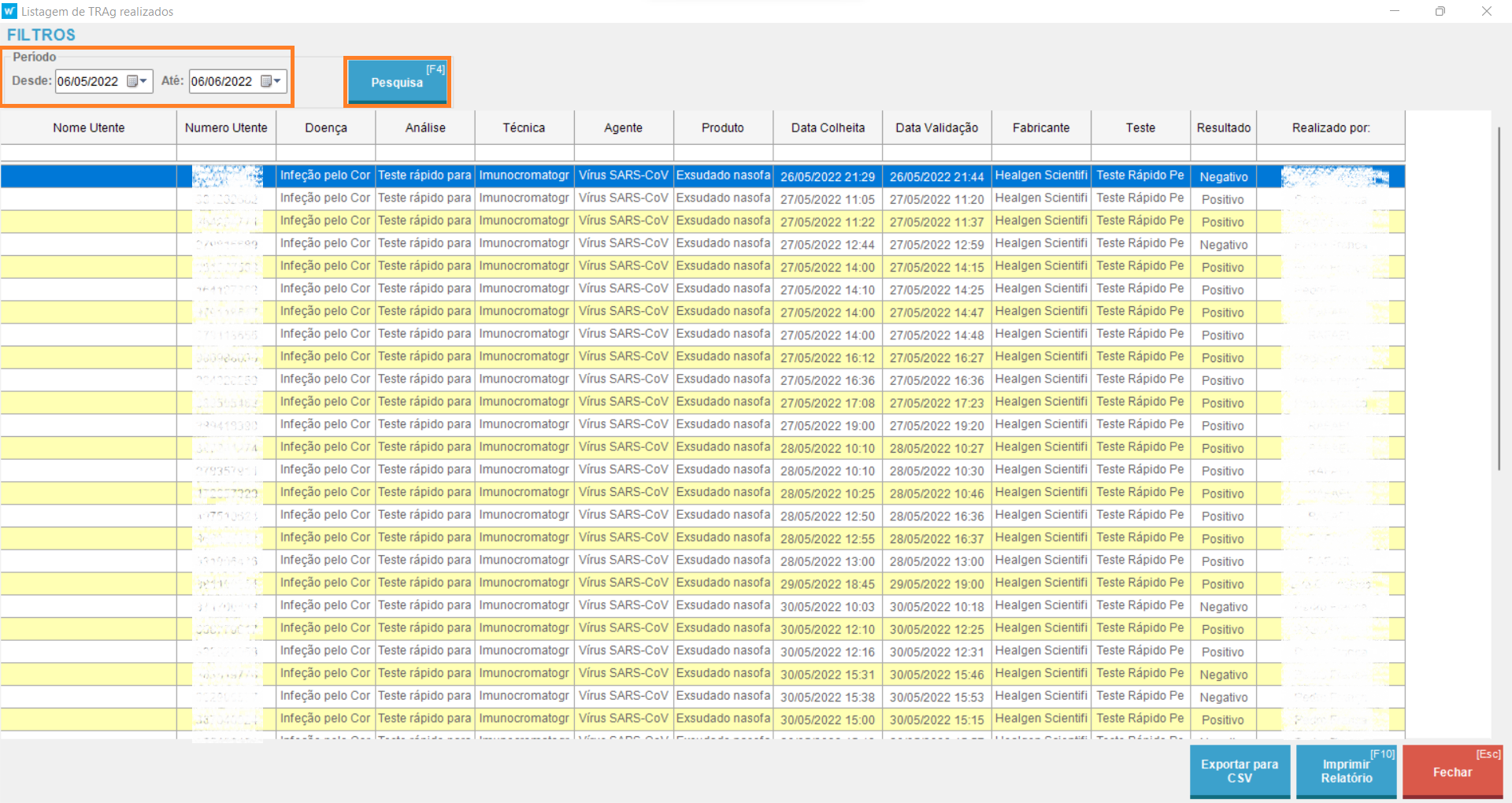 Depois poderá exportar a listagem obtida para o formato CSV ou realizar a impressão de um determinado relatório de teste Covid-19 clicando em Imprimir Relatório [F10] sobre a linha referente ao teste desejado.