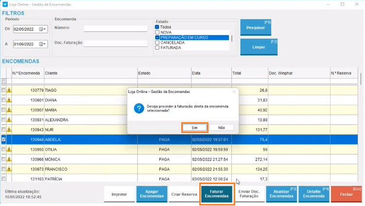 Outra relevante novidade está relacionada com a agilização da faturação ao cliente, uma vez que passou a ser possível faturar várias encomendas simultaneamente, através de um único clique. Para o efeito deverá marcar as encomendas pretendidas, clicar em Faturar Encomendas e depois em Sim para confirmar.