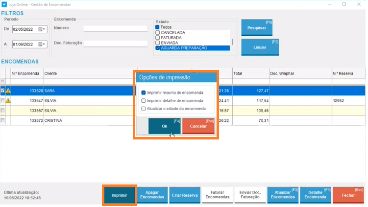 Através do menu dedicado Vendas > Loja Online > Gestão de Encomendas, onde é possível a criação de mapas de encomendas por estado, para um período definido, foram acrescentadas duas novas colunas: