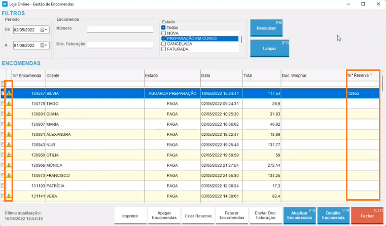 Agora também é possível Apagar Encomendas, assim como Criar Reservas automaticamente e de forma massiva para os produtos com sinal de alarme na primeira coluna, que serão posteriormente identificados de forma automática no módulo de reservas como produtos da Loja Online.