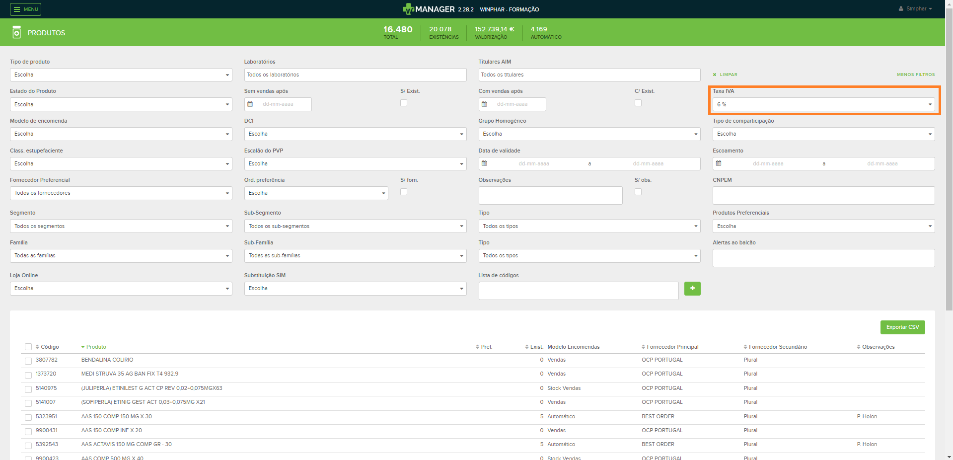 4. Winphar Manager: Novo filtro “Taxa de IVA”