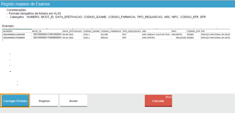NOTA: Caso exista no ficheiro global da farmácia alguma prestação efetivada com um código de exame diferente do preconizado para comparticipação pelo SNS (Código Exame 1525.1 – Pesquisa de Antigénio do vírus SARS-CoV-2 por imunocromatografia), a prestação não será importada para processamento.