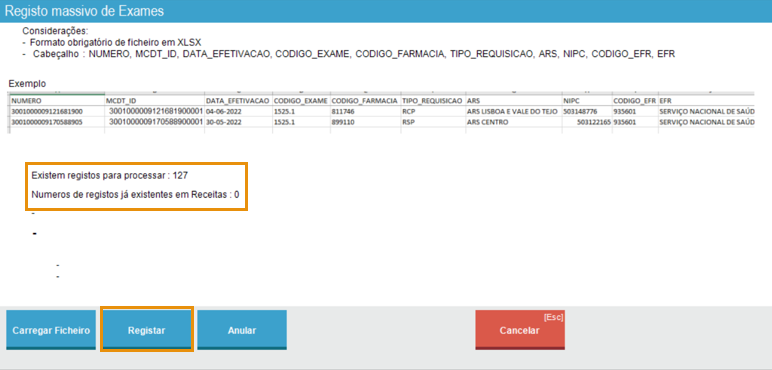 Depois, deverá clicar em [Registar] para que o Winphar proceda ao registo automático de todas as prestações incluídas no ficheiro no processamento de receituário da farmácia.